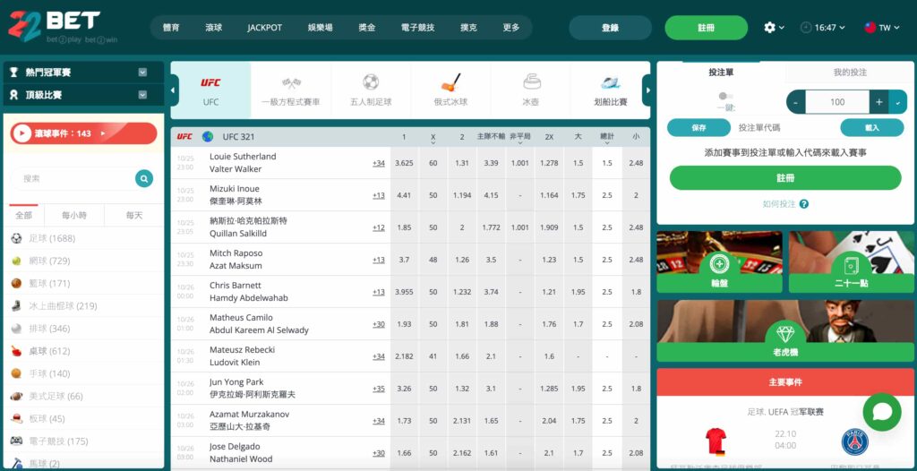22BET 創立於 2016 年,顧名思義是專注於體育博彩的平台。UFC 321 的賠率將在綜合格鬥類別中公布,除此之外還提供棒球、足球等世界各地的賽事投注。